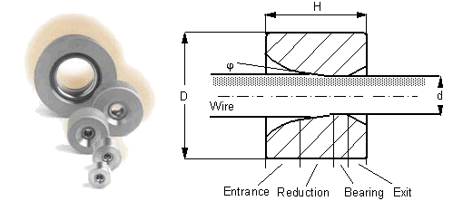 to keep the die cool. For good wire deformation, it is necessary to select a drawing die tool with the appropriate profile, designed for either ferrous or non-ferrous materials. Entry Lubrication is introduced, and the material is guided to the deformation zone (reduction/bearing) of the die. Reduction Generally speaking, harder (ferrous) materials require smaller reduction angles; softer (non-ferrous) materials require larger reduction angles. Included angles (2-alpha) may vary within the range 8�-30�, zone length (0.5...1)d. Bearing In this cilindrical part the deformed wire is calibrated to the desired size. The bearing length depends on the materials drawn and is specified as a percent of the bore hole diameter (0.3...0.6)d. As a general rule, harder materials demand longer bearings than softer ones. Wear on the bearing only occurs when heavy wear in the reduction zone was not remedied in timely fashion. Exit This zone, in which the deformed wire leaves the die tool, must provide sufficient support for the axial mechanical wire drawing stress which occurs. Some purposes for which the drawing die tools were designed require that transitions among the various zones are perfectly blended, with smaller radii for harder materials, larger radii for softer. Back relief, so-called, is often provided as a high-polish transition phase to allow the wire to exit smoothly from the bearing of the die. Die wear takes place mainly in the reduction