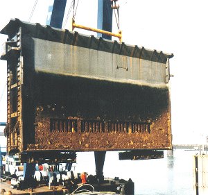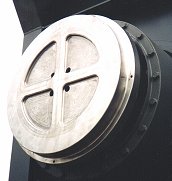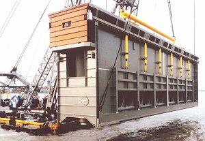 water, squeezed between the lock gate and a smooth plastic threshold. The system is due to be used for the first time ever in the "Oranje" locks in the river IJ in Amsterdam which is completed in 1995. A wear-resistant opening and closing mechanism which will need practically no maintenance is realised. For the "Oranje" locks two circularly shaped hydrostatic bearing have been constructed under the 25 m wide lock gate. One of them is visible in the picture below.