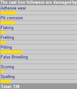 The contact face of the chilled cast iron followers appears to be damaged by micro pitting (left) respectively progressive pitting sometimes called spalling (right). The measured hardness of the surface is 52 HRC. Pitting is a surface fatigue phenomenon occurring in the presence of rolling and combined rolling with sliding. Damage occurs after a large number of load cycles, the so called incubation period. Traction forces significantly affect the level of material stresses and thus the life duration |